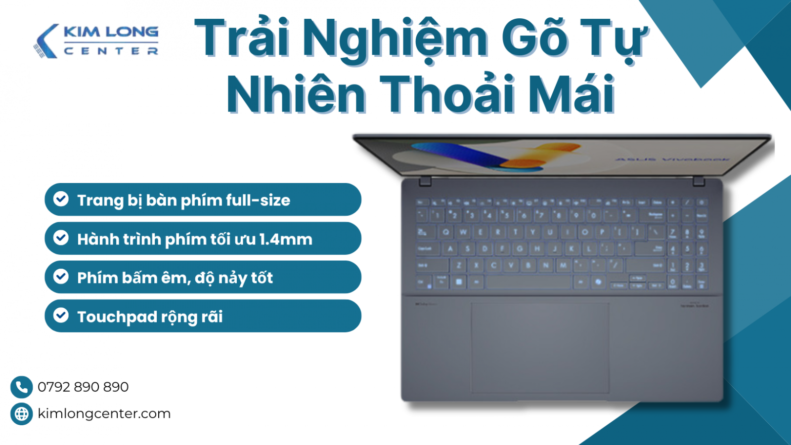 Vivobook S 16 OLED trang bị bàn phím full-size, hành trình phím tối ưu 1.4mm, mang lại trải nghiệm gõ tự nhiên và thoải mái. Phím bấm êm, độ nảy tốt, giúp nhập liệu nhanh và chính xác. Đặc biệt, bàn phím còn được trang bị đèn nền, hỗ trợ làm việc trong điều kiện thiếu sáng.