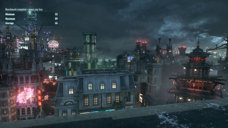Trong khi đó Batman: Arkham Knight, dù sử dụng engine đồ họa Unreal 3 cũ kĩ nhưng vẫn là tựa game có chất lượng đồ họa đẹp và không hề thua kém những tựa game mới khác. Cấu hình thử nghiệm đạt trung bình 66 fps và giảm còn 48 fps với chất lượng đồ họa ở mức High.