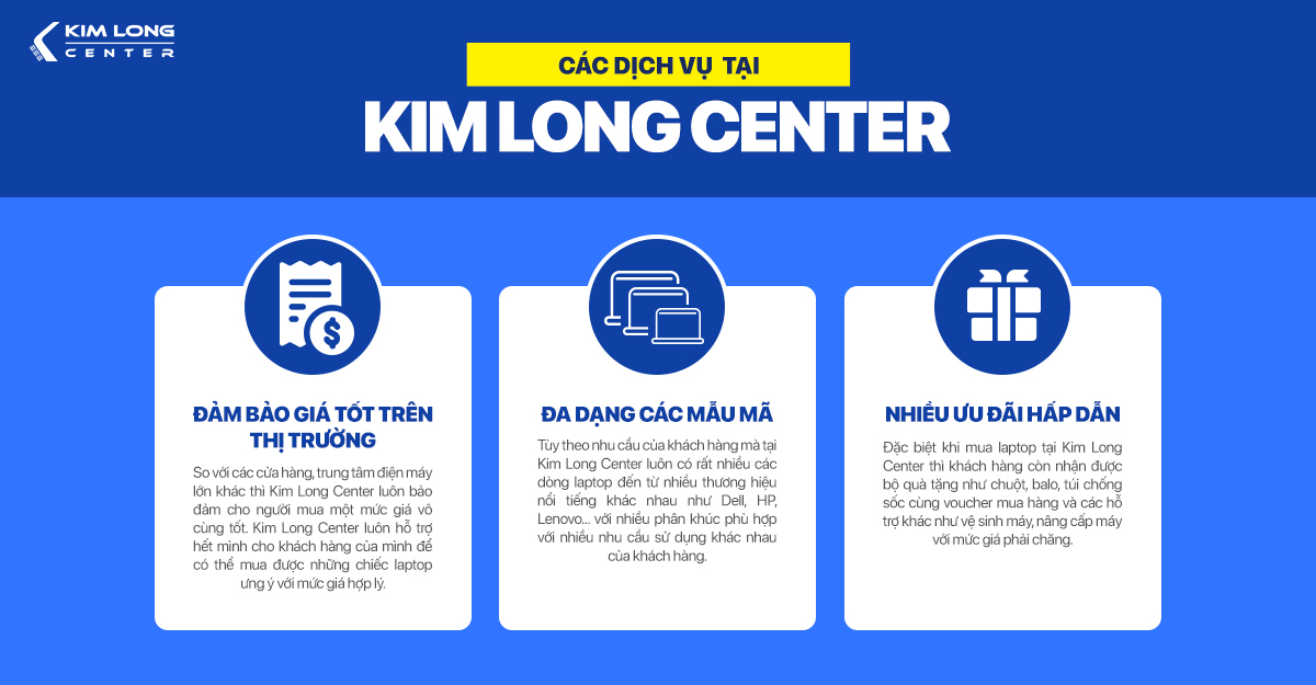 Với việc mua một sản phẩm công nghệ cao như thế thì bạn cũng nên tìm chọn mua laptop tại các cửa hàng, địa chỉ uy tín, có tên tuổi trên thị trường như cửa hàng Kim Long Center để được đảm bảo về những quyền lợi khi mua laptop nhé.